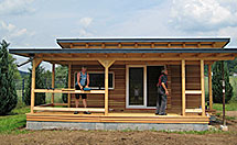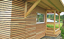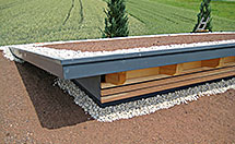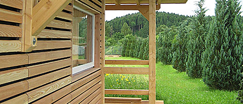 Gartenhaus mit Vordach und Lärchenleistenschalung, mit Pultdach, vorbereitet für Dachbegrünung.